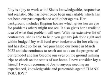 Joy helps home buyers and sellers navigate the Milton, Roswell, Alpharetta, and North Georgia real estate markets to find and secure a home that exceeds what they imagined. She also employs her financial and design knowledge and experience to help sell your home for top dollar. With a solid background in financial analysis (MBA), wealth management, real estate investment and financial consulting, she helps guide the complicated sales process to the end goal - a home that you and your family adore. Joy is committed to providing exceptional customer service and to building lasting relationships with her clients.